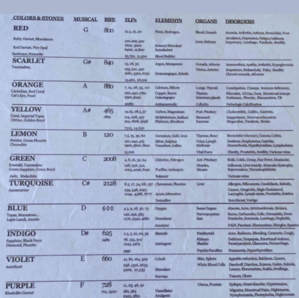 Adapted Prof. DR. Charles McWilliams's method of Electro Chrystal Therapy. Color-Sound-Gem energy as a means to open the body flow energy through the chakras and filter stored toxins, from hormone, stress, food-related waist-products.